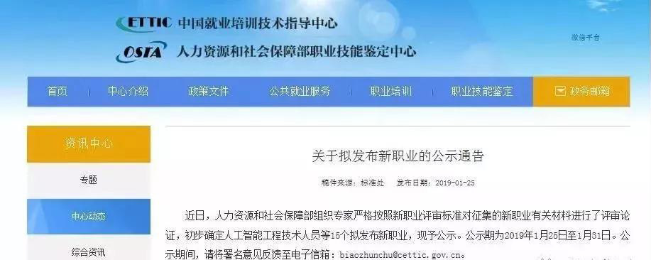 近日,人力資源和社會保障部組織專家嚴(yán)格按照新職業(yè)評審標(biāo)準(zhǔn)對征集的新職業(yè)有關(guān)材料進(jìn)行了評審論證,初步確定人工智能工程技術(shù)人員等15個(gè)擬發(fā)布新職業(yè),現(xiàn)予公示。公示期為2019年1月25日至1月31日。公示期間,請將署名意見反饋至電子信箱:biaozhunchu@cettic.gov.cn。