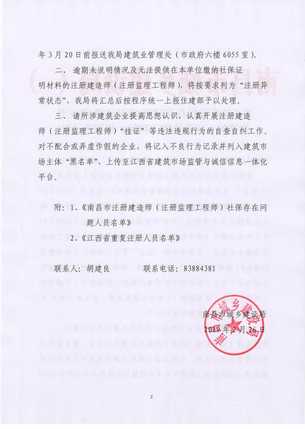 2019年2月26日南昌市住建局官網發布《關于核查社保存在問題(重復注冊)的注冊建造師(注冊監理工程師)情況的通知》,該通知附件公布了《南昌市注冊建造師(監理工程師)社保存在問題人員名單》
