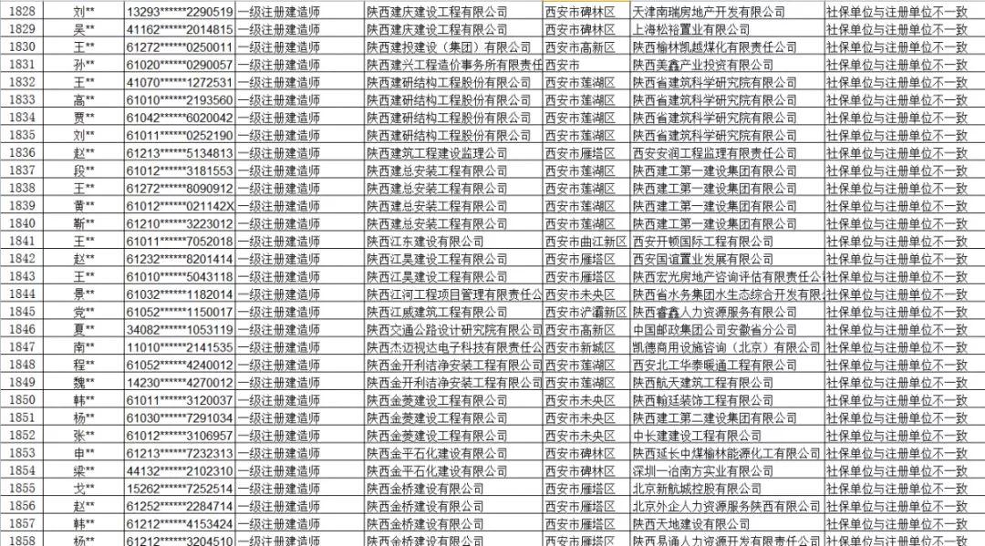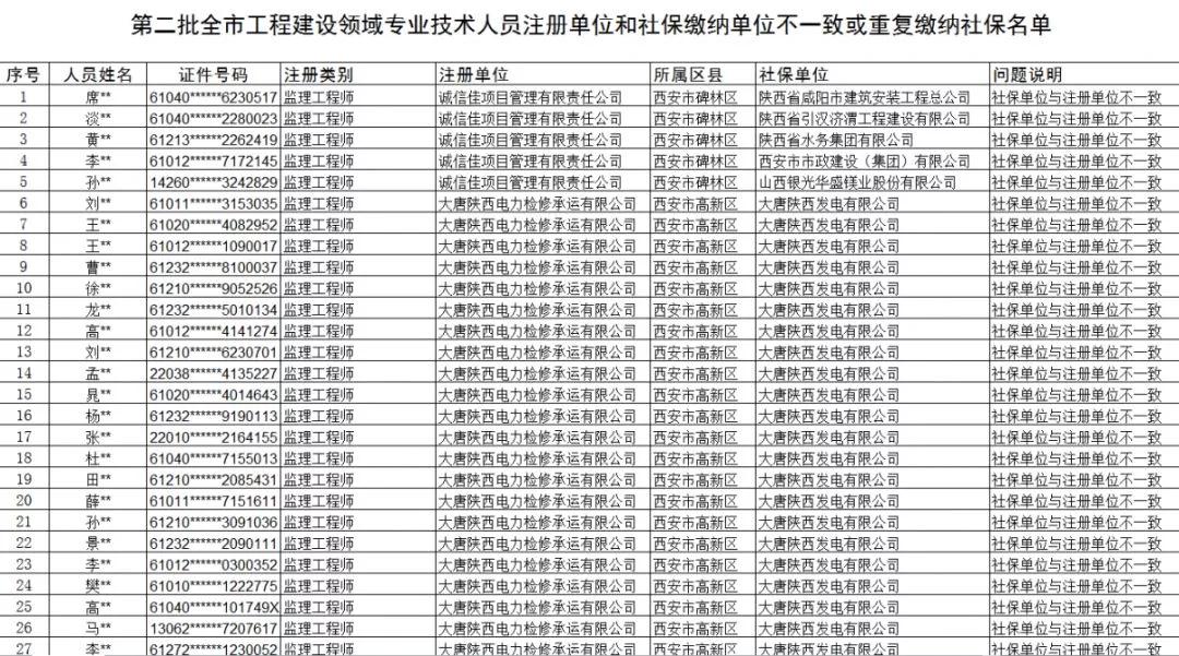 2019年2月22日西安市城鄉建設委員會官網發布《第二批全市工程建設領域注冊人員注冊單位和社保繳納單位不一致或重復繳納社保人員名單》,第二批共1858名人員。問題為:社保單位與注冊單位不一致;