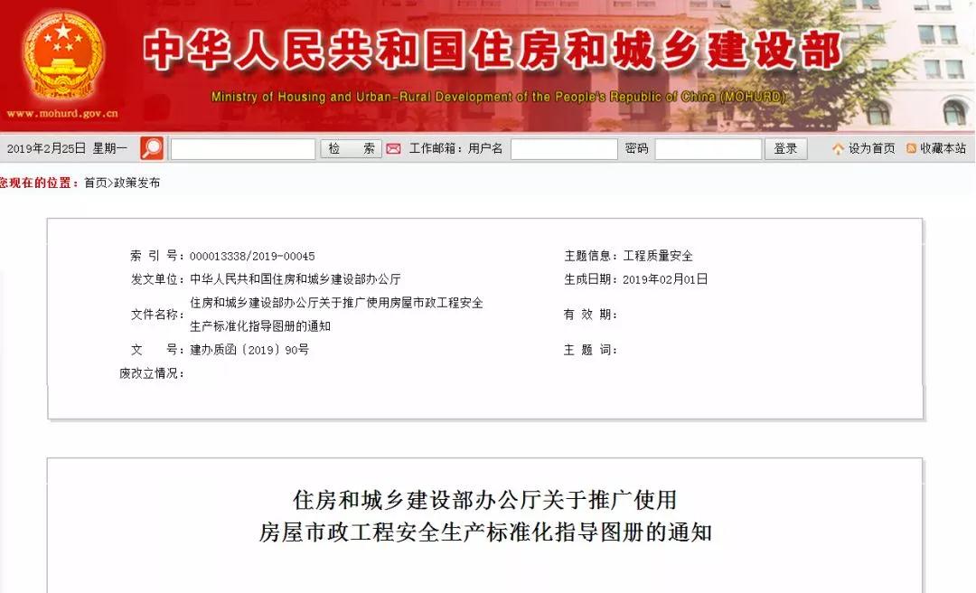 住建部發(fā)布《房屋市政工程安全生產(chǎn)標準化指導圖冊》,并要求全國推廣使用發(fā)布日期:2019-02-28