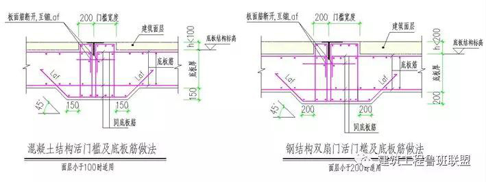 三是綁扎門檻鋼筋要求:活門檻門及封堵框的下檻鋼筋應按圖紙大樣要求綁扎。活門檻門預埋角鋼、封堵框下框前后應設置大小兩道暗粱;活門檻門預埋角鋼、封堵框下框水平面應與通道地坪相持平。當建筑找平層(含裝修層)厚度小于門及封堵框下框高度時(鋼筋混凝土門小于100mm;鋼結構雙扇門及封堵框小于200mm時),底板鋼筋應做下凹處理,設計單位應提供大樣詳圖,審圖單位應審查把關,人防門生產安裝企業不得切割下框鋼板(參見附件:《鋼筋下凹施工設計大樣詳圖》)。