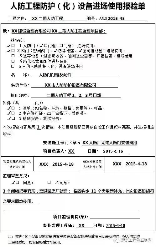 凡定型設備及配件數質量出廠達不到規定標準的不得安裝,如果現場無法修復時,應退回生產廠家處理。(參見附件:《人防工程防護(化)設備進場使用報驗單》)。