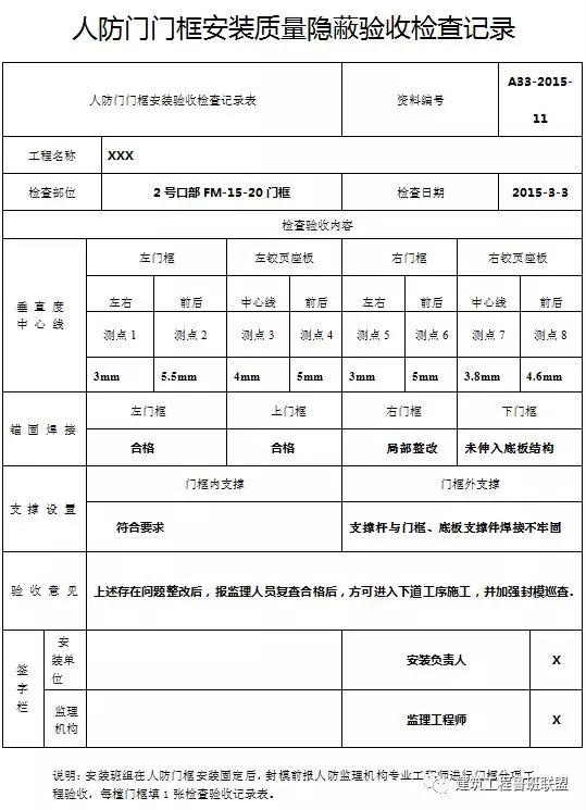 4、隱檢:在門框安裝固定后,在安裝班組自檢的基礎上,檢測單位要提前介入對先期安裝的門框質量進行質檢,以對下一步的安裝質量控制,起一個示范引領作用;監理機構在封模隱蔽前,要對門框安裝質量逐樘進行檢查驗收。隱檢的主要內容有:左門框左右方向、前后方向垂直度;右門框左右方向、前后方向垂直度;門框鉸頁座板中心線和前后方向垂直度;檢查錨固鉤與門框的搭接長度、焊接質量和間距,檢查支撐固定等內容,并填寫門框安裝分項工程驗收記錄表,不符合要求的應及時下達整改指令(參見附件:《人防門門框安裝質量隱蔽驗收記錄表》)。