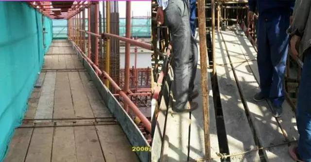 1)施工現場腳手架搭設完成腳手板鋪設必須滿鋪腳手板對接必須正確,在架子拐彎處,腳手板應交錯搭接,并且必須綁牢,不平處用木塊墊平釘牢;