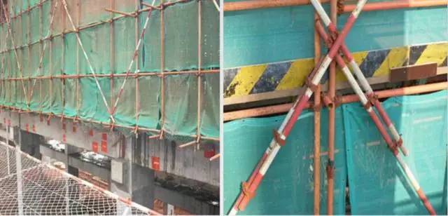 3)在腳手架垂直高度每10-15米需設置防墜落措施,在架體外側要及時設置密目網。內側安全網鋪設時必須要拉緊,安全網固定繩必須環繞綁扎的固定可靠處。