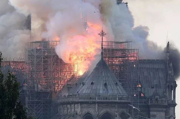 火勢蔓延速度很快,難以控制。在緊張圍觀的人群注視下,巴黎圣母院標志性的尖頂被燒斷,坍塌倒下。