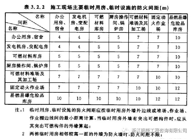3.2.2 施工現場主要臨時用房、臨時設施的防火間距不應小于表3.2.2的規定,當辦公用房、宿舍成組布置時,其防火間距可適當減小,但應符合以下要求: