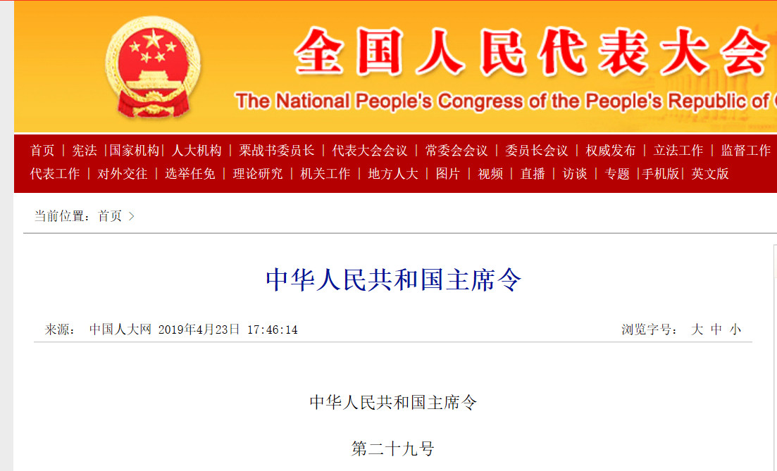 (2019年4月23日第十三屆全國人民代表大會常務(wù)委員會第十次會議通過)第十三屆全國人民代表大會常務(wù)委員會第十次會議決定:
