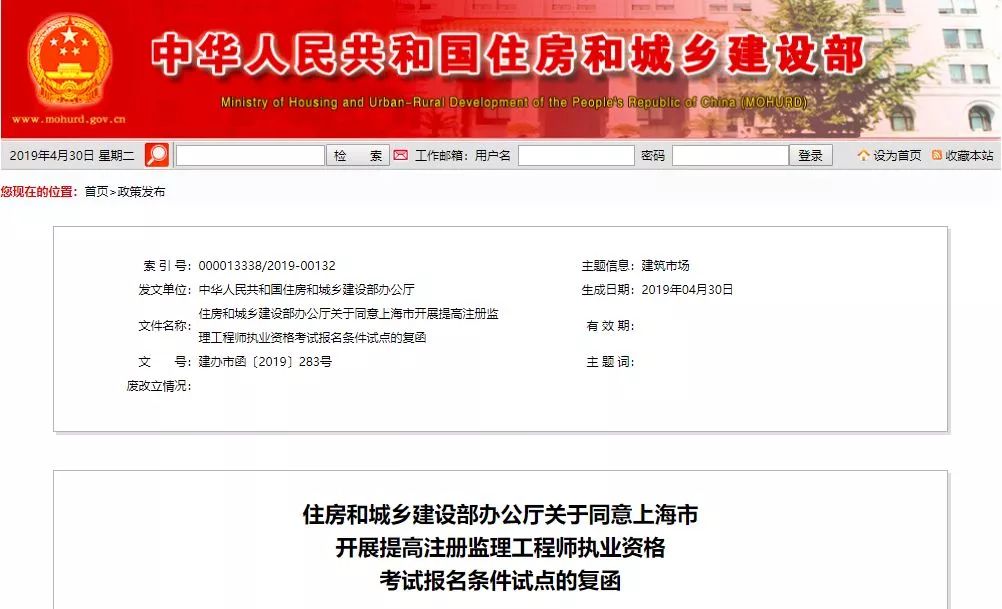 2019年4月30日住建部發布《關于同意上海市開展提高注冊監理工程師執業資格考試報名條件試點的復函》:同意上海市開展提高注冊監理工程師執業資格考試報名條件試點,試點自2019年4月30日開始。