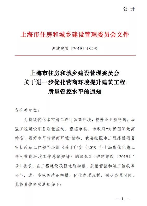 2019年3月27日上海市住建委發布《關于進一步優化營商環境提升建筑工程質量管控水平的通知》,通知明確提出:
