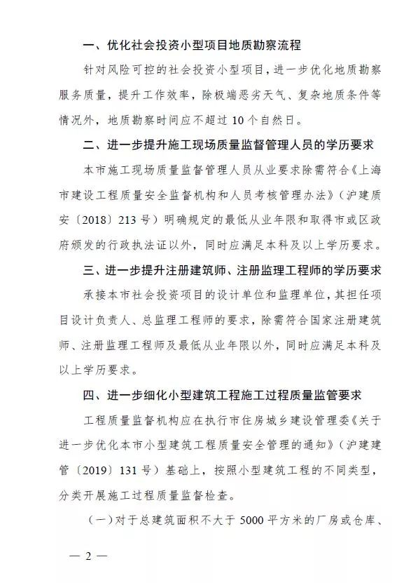 進一步提升注冊建筑師、注冊監理工程師的學歷要求:承接本市社會投資項目的設計單位和監理單位,其擔任項目設計負責人、總監理工程師的要求,除需符合國家注冊建筑師、注冊監理工程師及最低從業年限以外,同時應滿足本科及以上學歷要求。