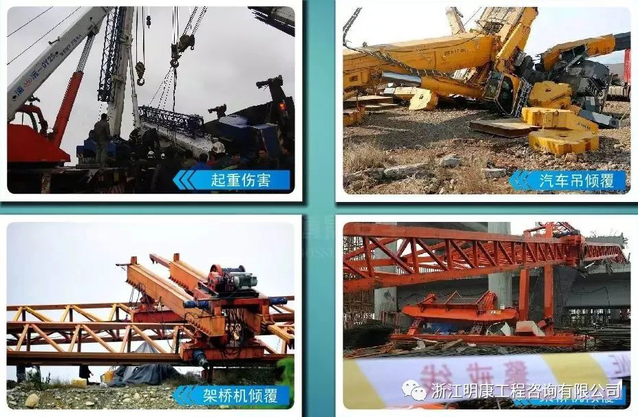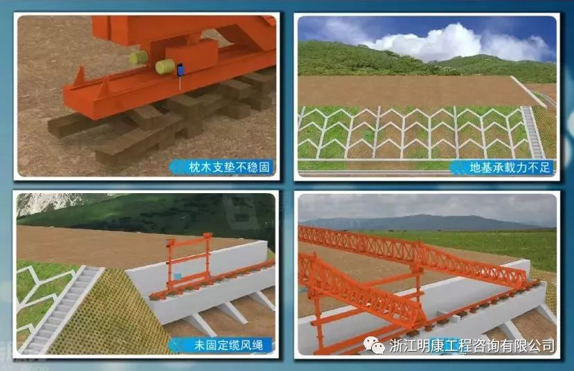 由于作業人員違章操作、違章指揮、外力撞擊造成的汽車吊傾覆,安裝過程中失穩造成的架橋機傾覆,路基和線路質量差、趕工期、設備故障等易導致架橋機運行時發生傾覆。