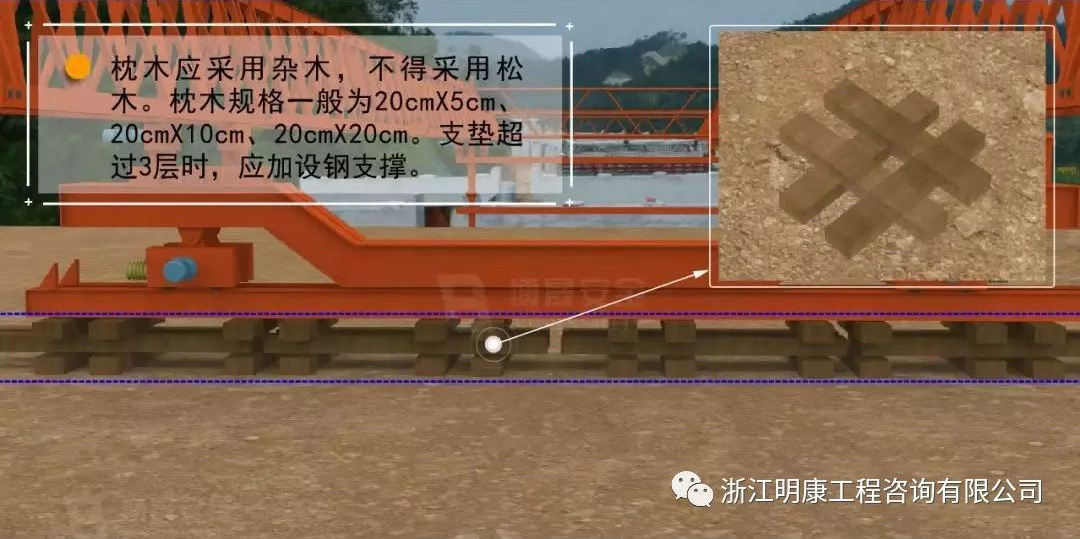 7、橫移軌道下的枕木鋪設應穩固,前支腿宜采用枕木及型鋼組合支撐,高度應根據橋梁橫坡調整,保證鋼軌的橫坡小于 0.5%,枕木搭設應不大于3 層,宜采用“井”字型墊法,最上層枕木方向垂直于橫梁方向,相鄰支撐枕木凈距應不大于 0.5m。
