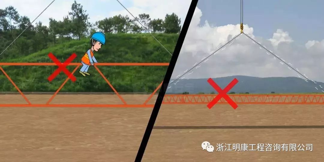 15、桁架、橫梁、支腿等構件在起吊時必須設纜風繩,防止構件晃動碰撞其他部件。