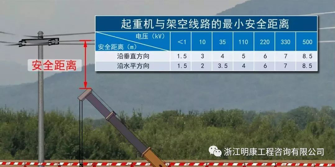 17、不得在高壓線正下方進行起重吊裝作業或堆放機具、雜物,嚴禁越過無防護設施的外電架空線路作業,臨近高壓線時應滿足安全距離要求。