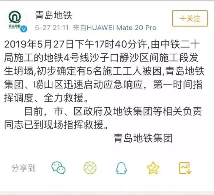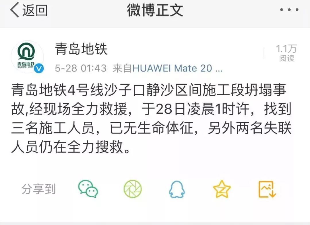 5月28日,青島地鐵坍塌造成了至少3人死亡的事故。