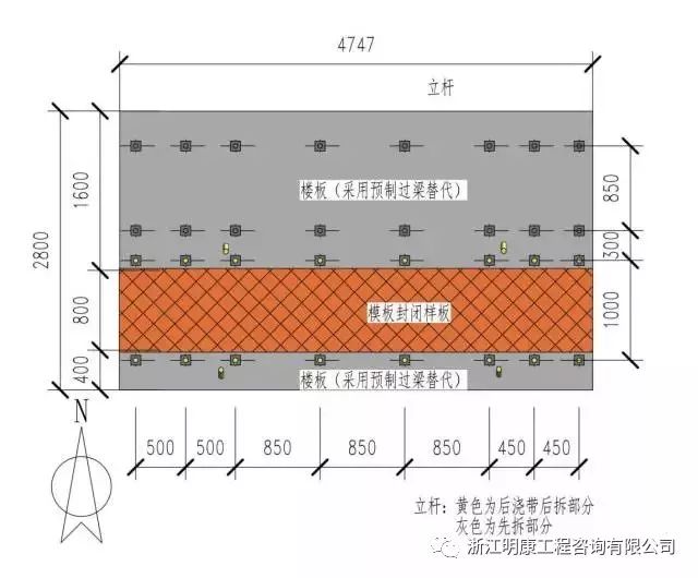 立桿布置如上圖所示,下面樓板采用預制過梁替代,后澆帶寬度800mm,采用模板封閉。