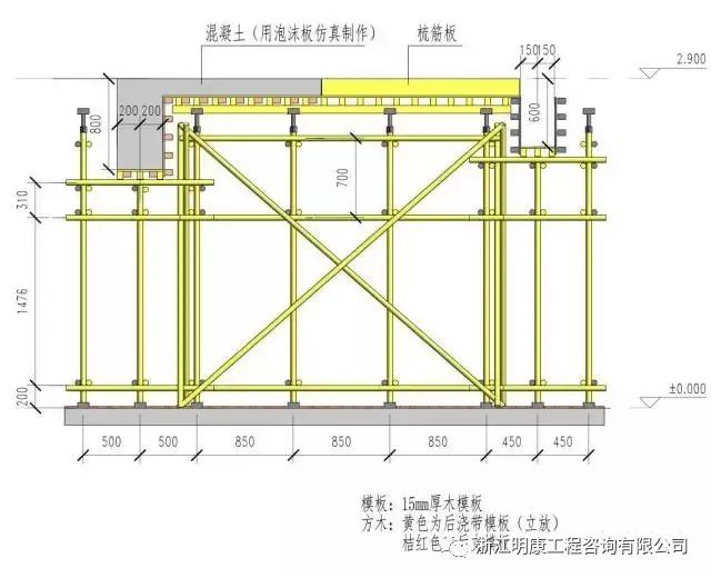 后澆帶樣板分為兩個部分,一半是支模樣板,另一半是混凝土澆筑完成,支后澆部分的模板,后澆帶支撐獨立設置。具體的做法是這樣的:
