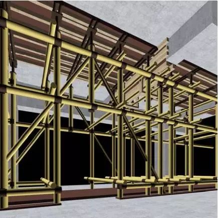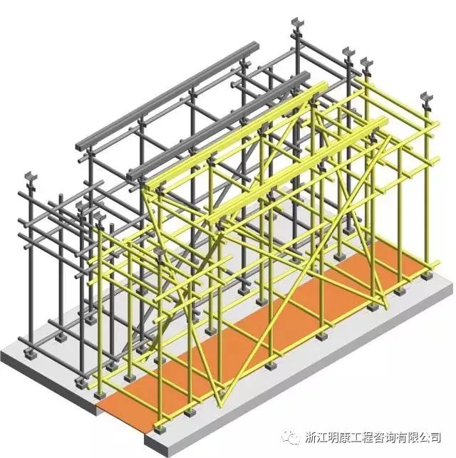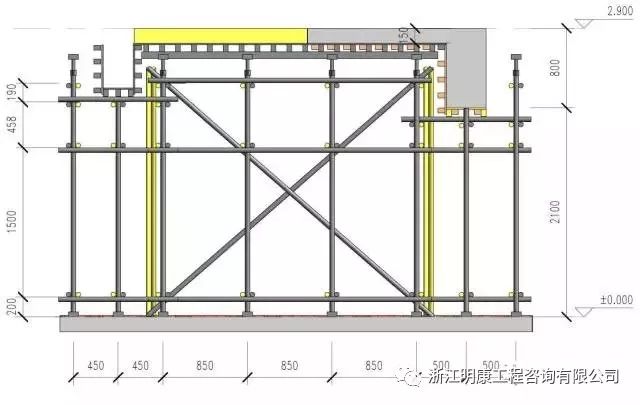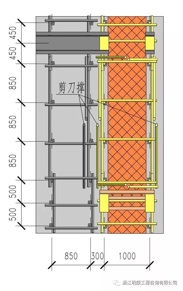 這個圖片看得比較清楚,水平桿是分開的,而且是錯開設置的。后澆帶設置獨立的剪刀撐,梁板模板剪刀撐單獨設置,拆模時,將灰色支撐拆掉,保留黃色支撐就可以了!