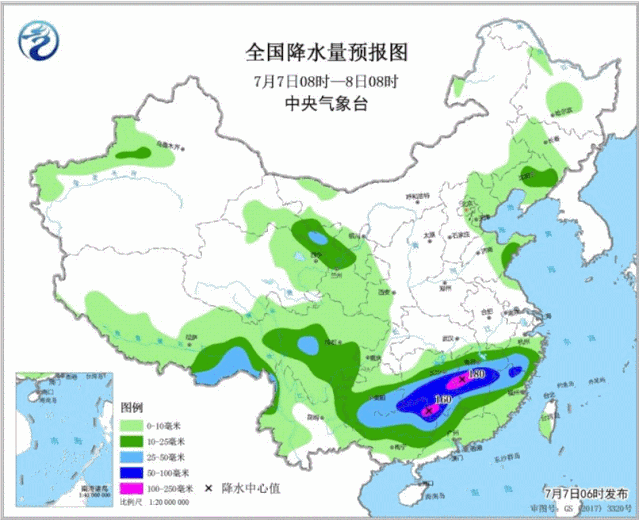 7月7日08時(shí)至8日08時(shí),貴州、廣西、廣東、湖南、江西、福建、浙江以及西藏等地有大雨,貴州、廣西、湖南、江西、浙江、福建等地的部分地區(qū)有暴雨或大暴雨(100~180毫米),上述部分地區(qū)局地并伴有雷暴大風(fēng)或短時(shí)強(qiáng)降水等強(qiáng)對(duì)流天氣。