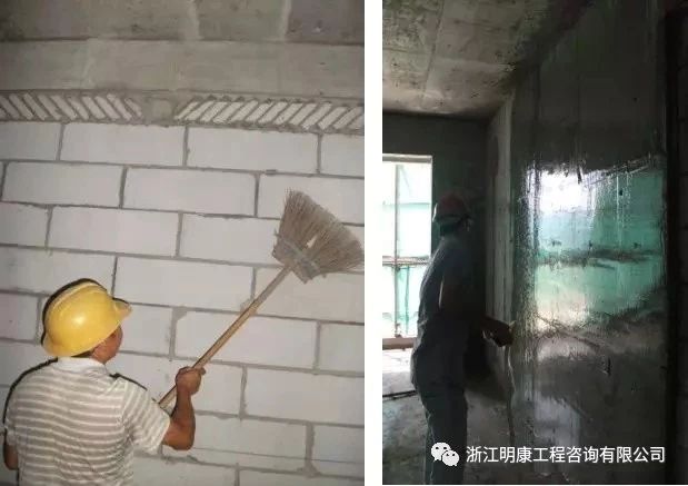 抹灰前應對加氣砼砌塊基層進行處理。其做法是:澆水一遍,沖刷去墻面渣末。嚴格杜絕由于抹灰前基層底部清理不干凈或不徹底,抹灰前不再澆水。