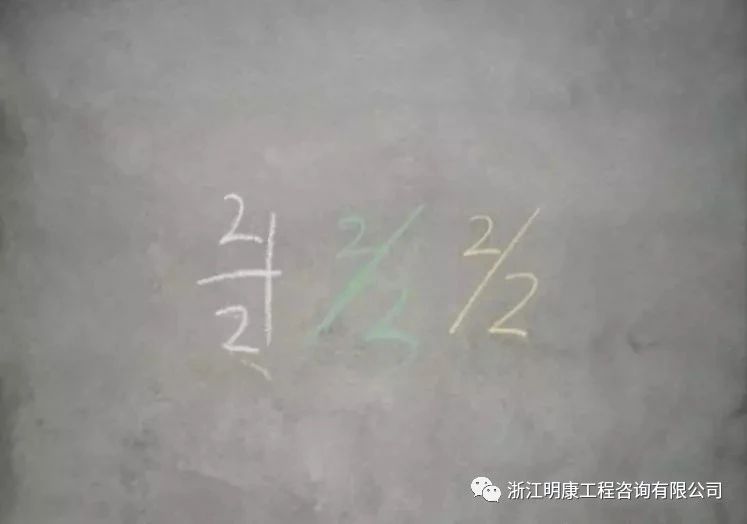 抹灰完成后,總包、監理、甲方實測結果分別用白、藍、紅色粉筆標注在墻面上。