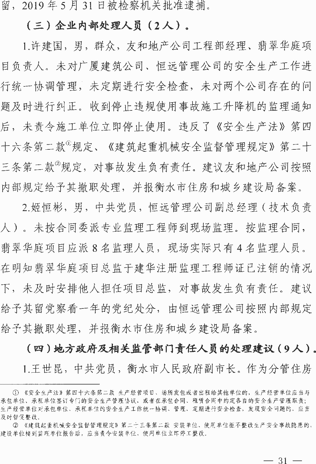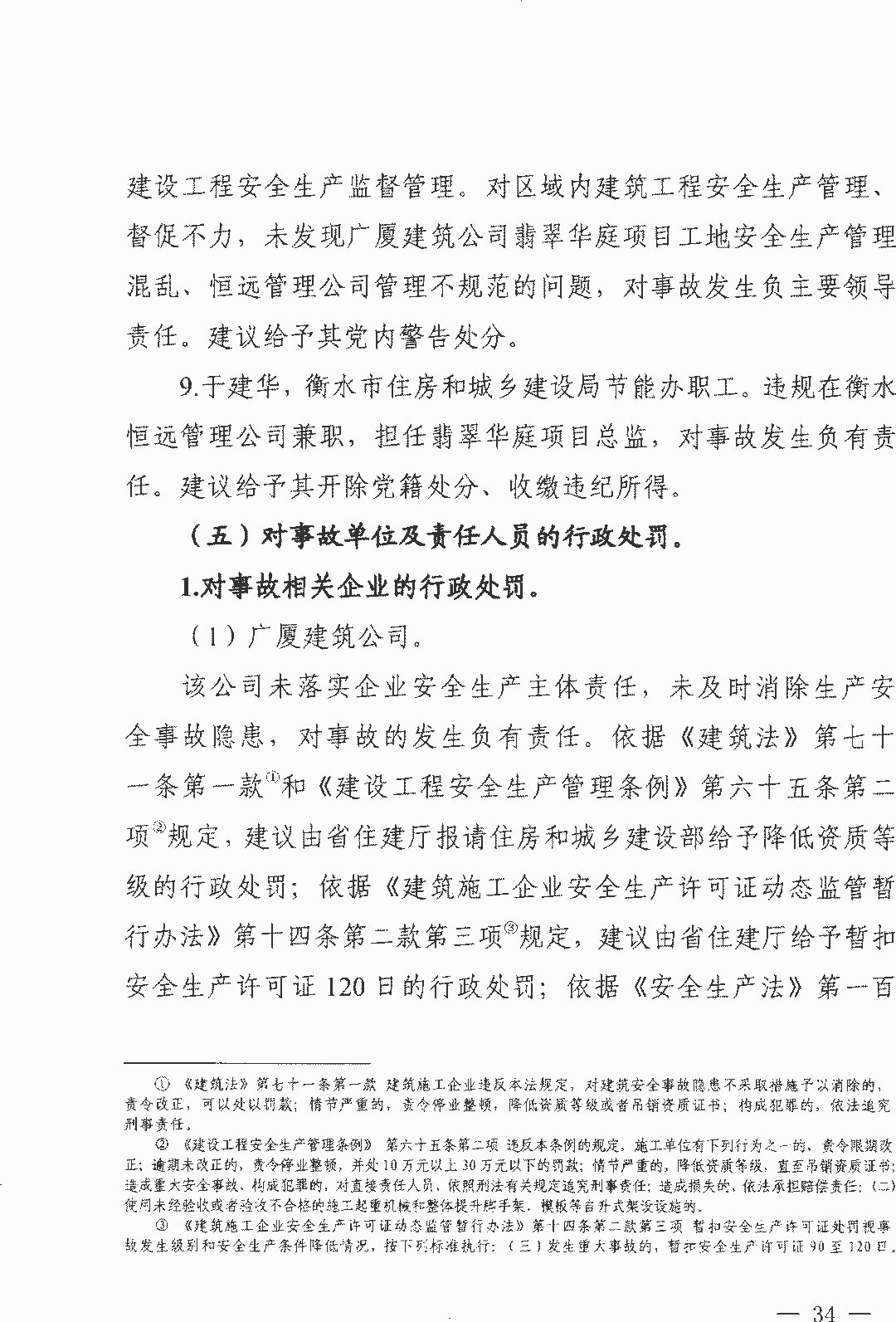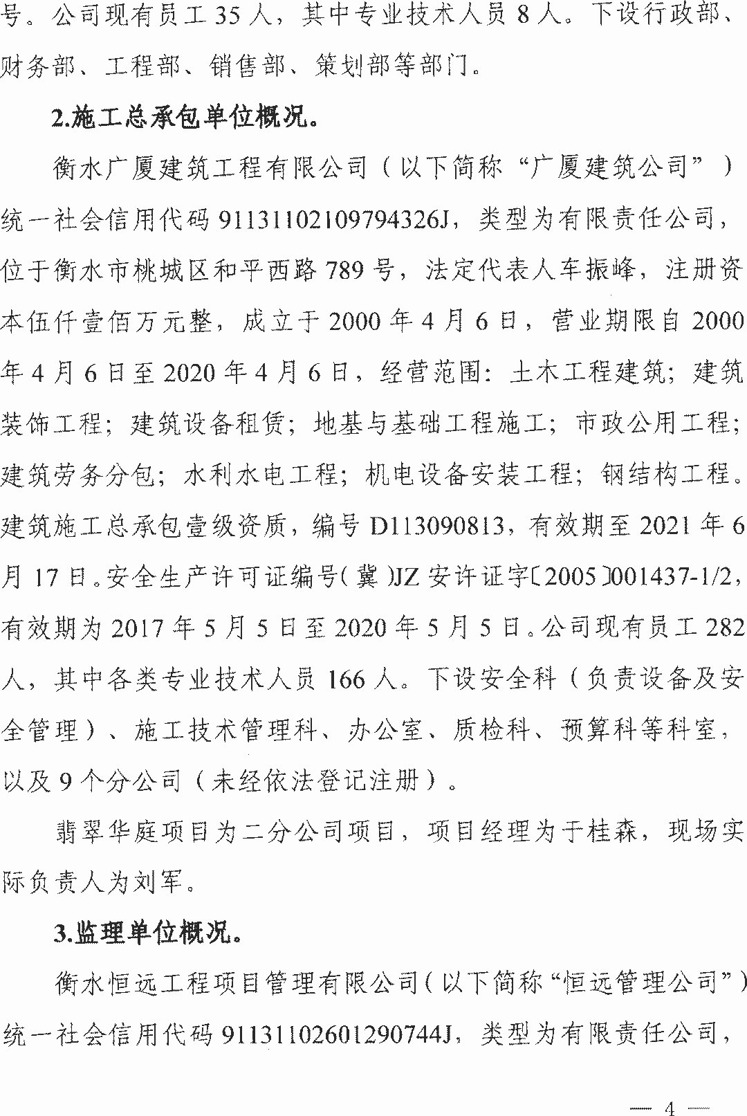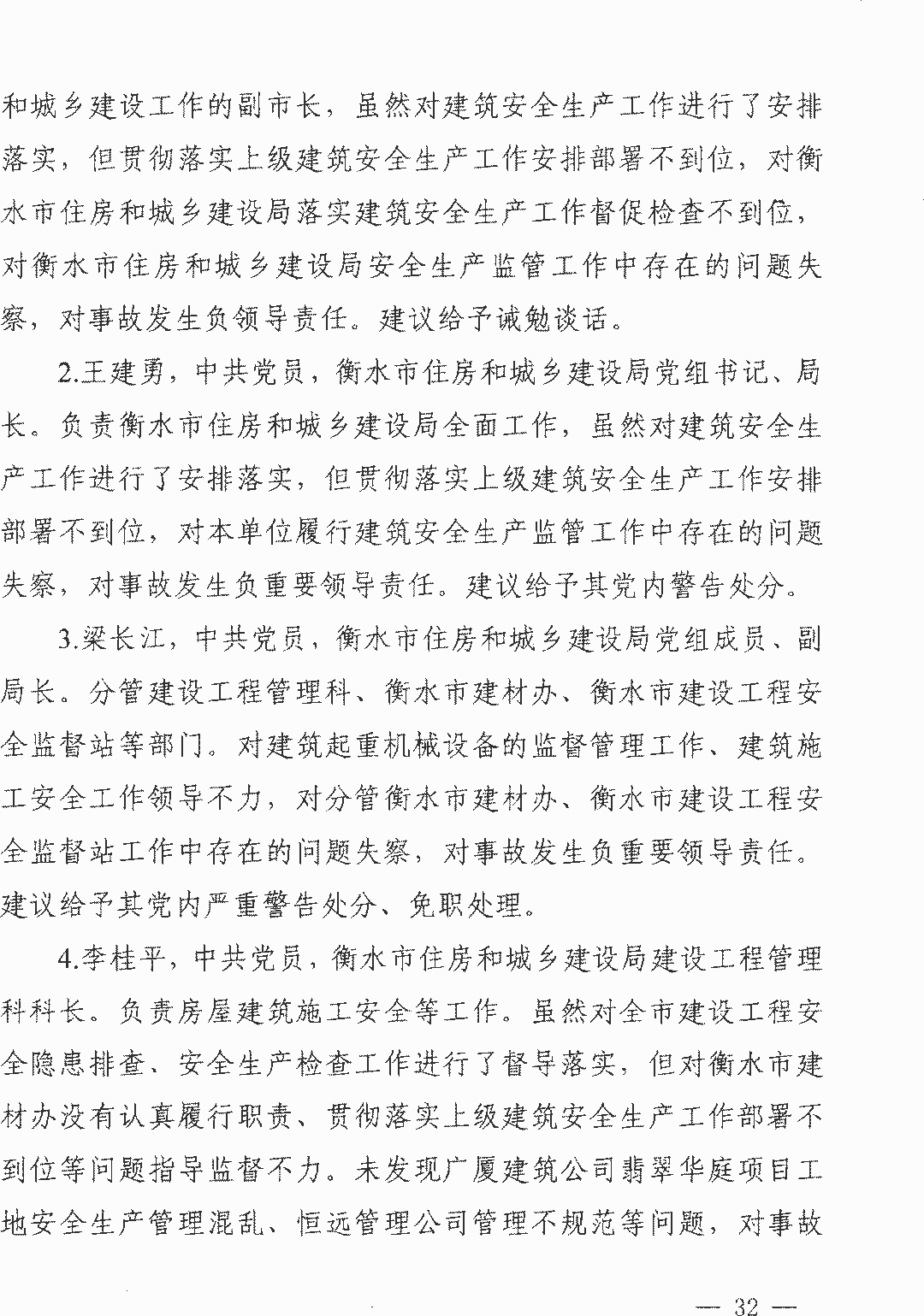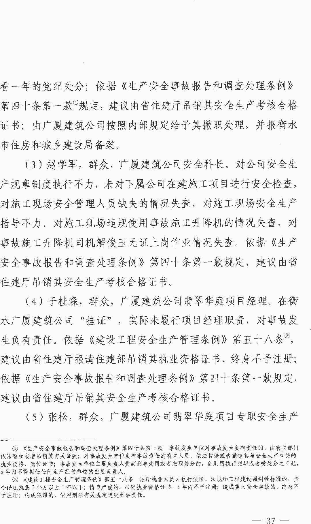 于桂森,翡翠華庭項目經理,在衡水廣廈建筑公司“掛證”,建議吊銷執業資格證書、終身不予注冊,建議吊銷安全生產考核合格證書,已被檢察機關批準逮捕。