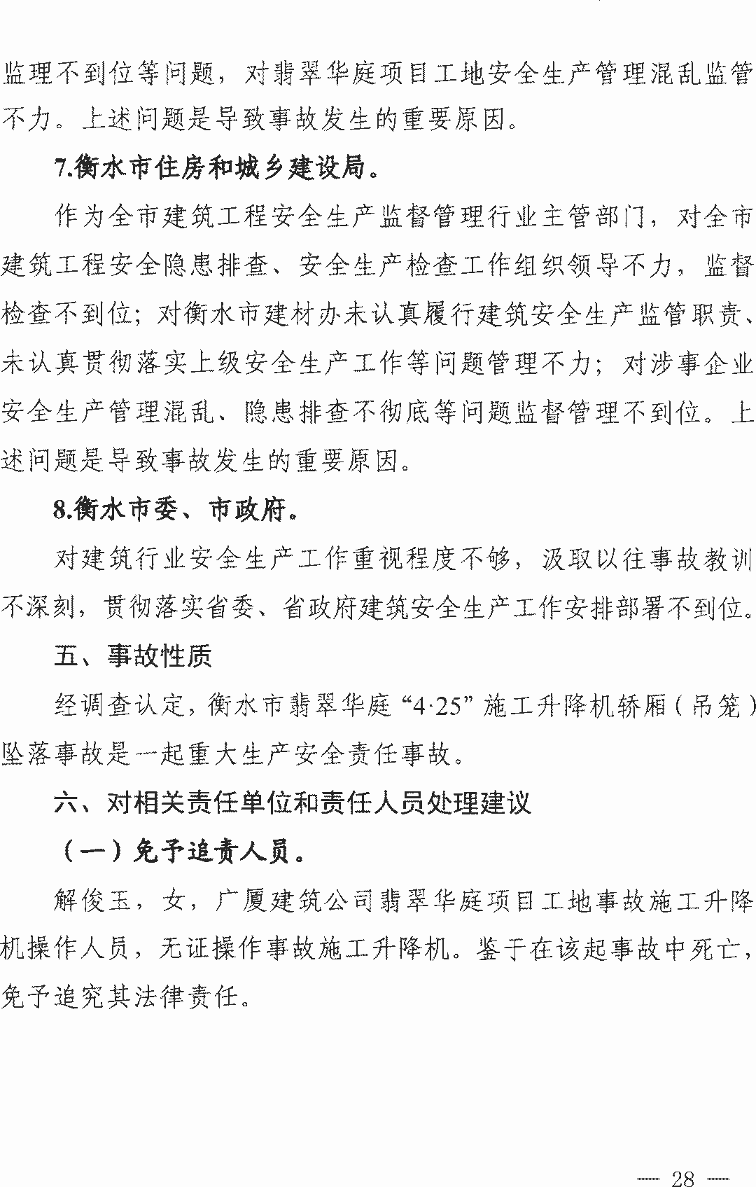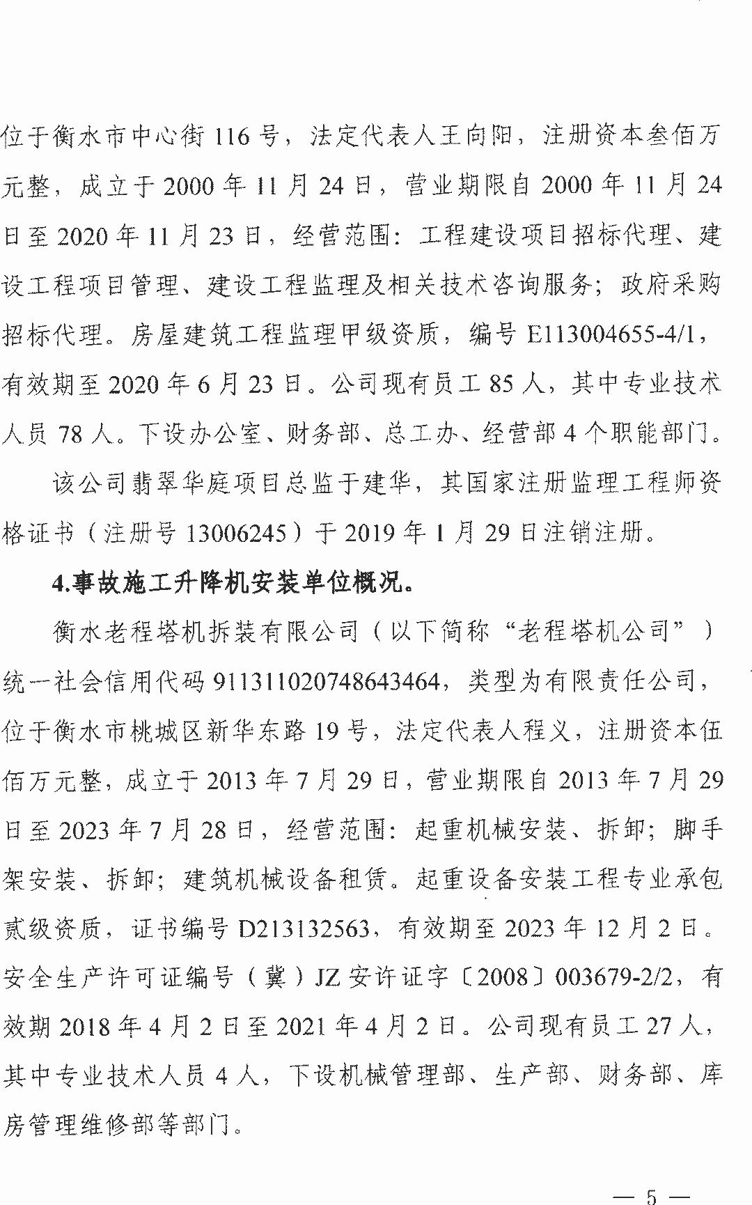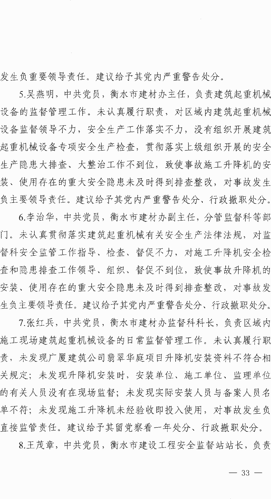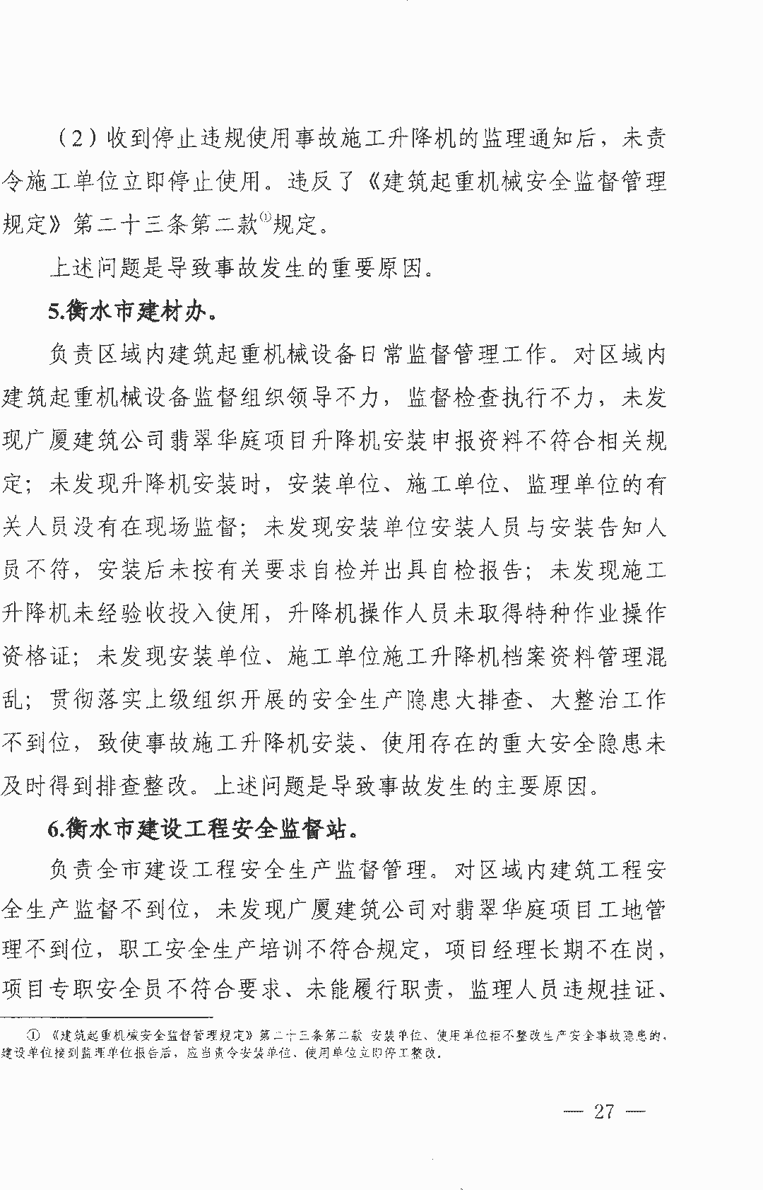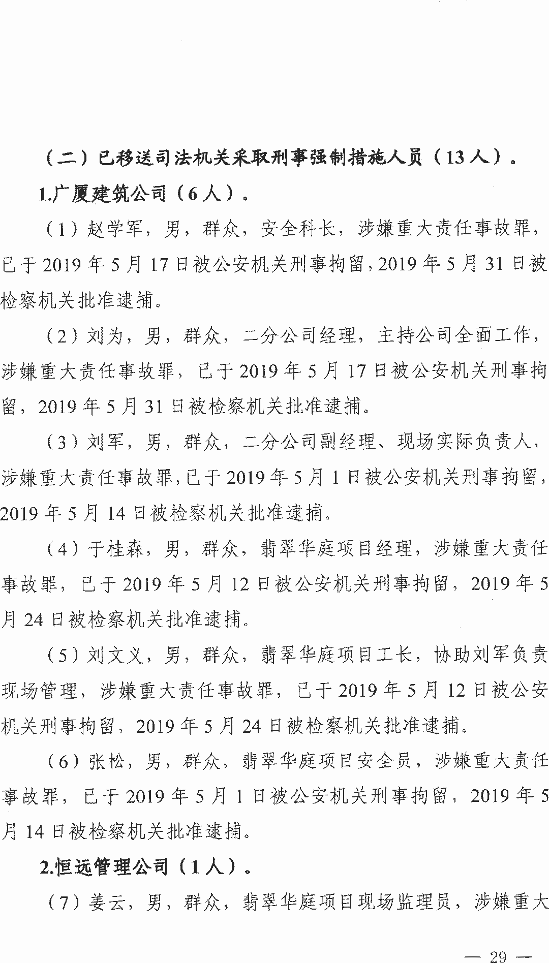 于桂森,翡翠華庭項目經理,在衡水廣廈建筑公司“掛證”,建議吊銷執業資格證書、終身不予注冊,建議吊銷安全生產考核合格證書,已被檢察機關批準逮捕。
