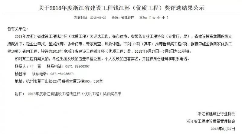 2018年6月27日,浙江省建筑業(yè)行業(yè)協(xié)會(huì)與浙江省工程建設(shè)質(zhì)量管理協(xié)會(huì)發(fā)布了「關(guān)于2018年度浙江省建設(shè)工程錢江杯(優(yōu)質(zhì)工程)獎(jiǎng)評結(jié)果公示」