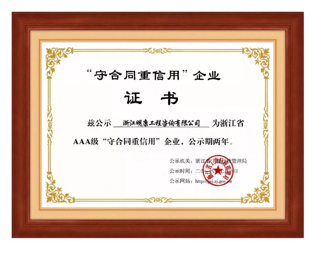 浙江明康工程咨詢有限公司連續第4次獲得浙江省AAA級“守合同重信用”企業的殊榮!
