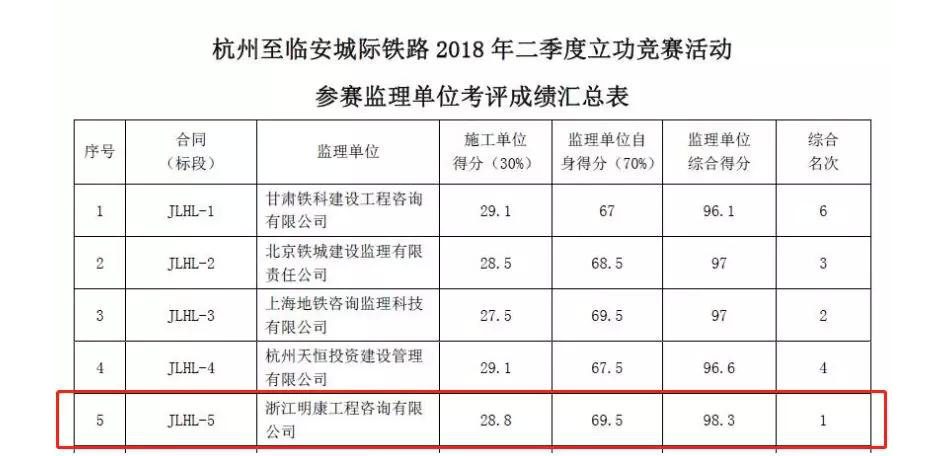 在杭州至臨安城際鐵路監(jiān)理單位競(jìng)賽考評(píng)中,我司監(jiān)理的(JLHL-5 標(biāo))以98.3分的優(yōu)異成績(jī)摘得桂冠。