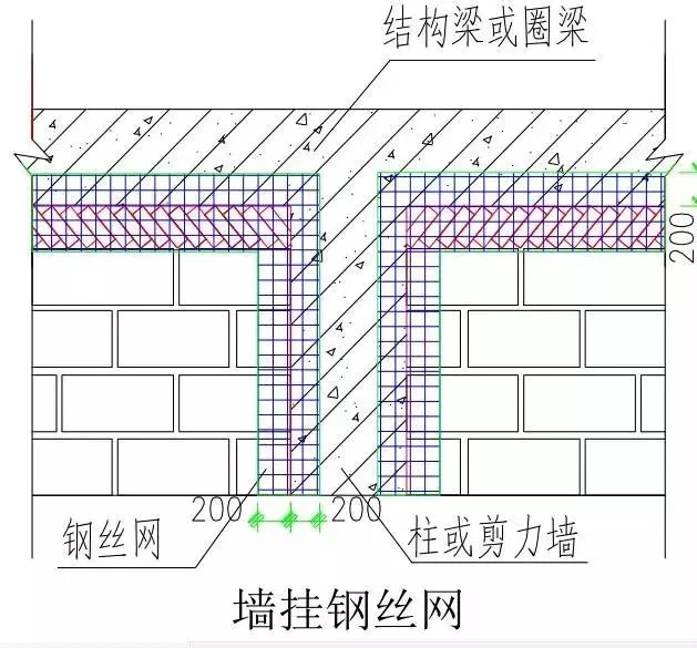 砌體砌筑完成后在砌體與混凝土接縫處掛鋼絲網,減輕砌體材料與混凝土結構之間因線脹系數而引起的抹灰層裂縫。