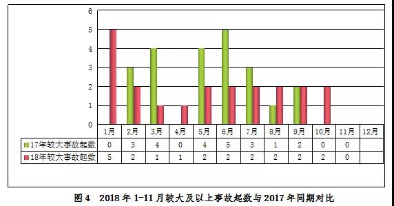 2018年1-11月,全國共發生房屋市政工程生產安全較大及以上事故21起、死亡84人,比去年同期事故起數減少1起、死亡人數減少2人,分別下降4.55%和2.33%。