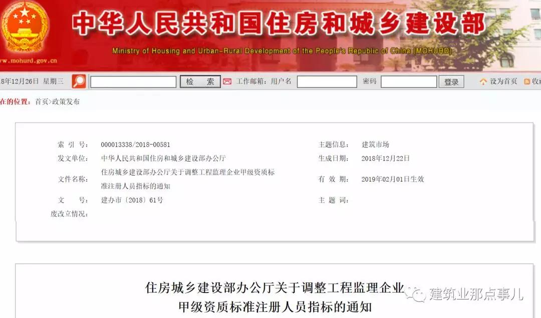 監(jiān)理資質(zhì)大變革,住建部發(fā)文:甲級注冊人數(shù)按乙級標(biāo)準(zhǔn)核定!發(fā)布日期:2018-12-27