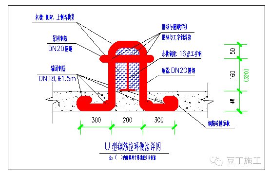 根據(jù)相關(guān)規(guī)范及我司的經(jīng)驗,在懸挑梁上設(shè)置立桿固定腳,采用DN25鋼筋頭與鋼梁滿焊。