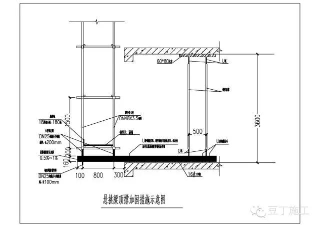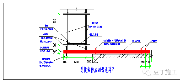 1)立桿直接立在懸挑梁上,外端立桿距懸挑梁端不應(yīng)小于100mm,挑梁懸挑端焊接200mm高直徑25mm的鋼筋,用于固定鋼管,防止方管的滑動。
