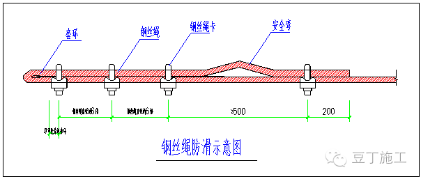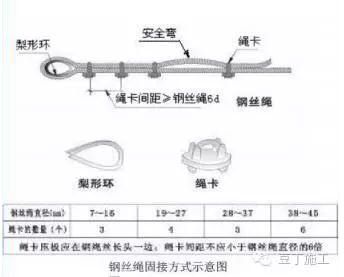 鋼絲繩的受力卡扣應(yīng)等距布設(shè)3個或以上,間距鋼絲繩直徑6倍,第4個卡扣為保險卡扣。鋼絲繩卡扣螺絲應(yīng)全部擰緊,不允許松動,繩的末端應(yīng)形成一個安全彎,以檢視繩受力時有無末端滑移的現(xiàn)象。其大樣圖如下圖所示。