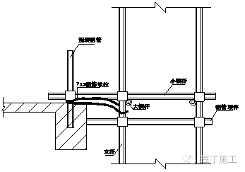 1)現(xiàn)澆混凝土的梁板上預埋豎向短鋼管,然后用連接短鋼管一端與預埋豎向短鋼管用直角扣件連接,另一端用直角扣件與立桿連接,并增加Φ12的鋼筋軟拉和鋼管頂件。