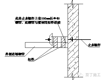 3)架體與剪力墻連接處,采用止水螺桿外套鋼管與架體連接,如下圖所示。