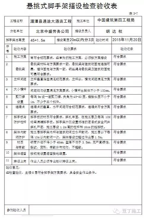 架子搭設(shè)和組裝完畢,使用前必須由公司負責人帶隊檢查,項目經(jīng)理、技術(shù)負責人、項目安全負責人、架子班長等人員組成檢查小組參與檢查,進行驗收,并填寫驗收單。