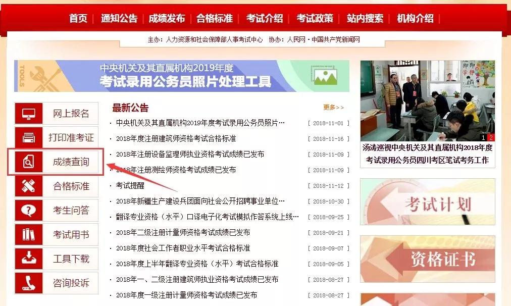 點擊首頁左側“成績查詢”,進入2018年一級建造師成績查詢入口。如圖所示: